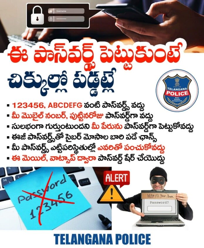 South ZoneTelangana తెలంగాణ పోలీస్ వారి యచ్చరిక By Bharat Aawaz - 26 April 2026 0 0 Share FacebookXWhatsAppLinkedinReddItPrintTelegramCopy URL ఈ పాస్వర్డ్స్ పెట్టుకుంటే చిక్కుల్లో పడట్టే