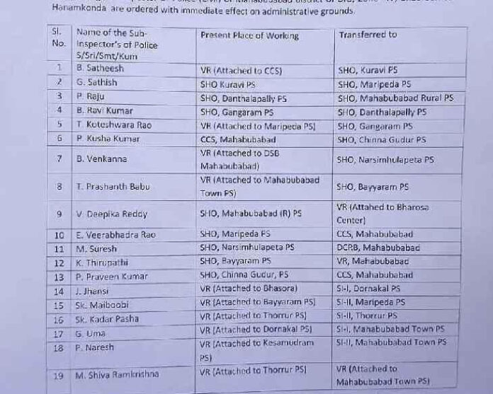జిల్లాలో 25 మంది ఎస్సైలు బదిలీ అయ్యారు. మహబూబాబాద్ సీసీఎస్కు వీరభద్ర రావు, ప్రవీణ్ కుమార్, గంగారం – కోటేశ్వరరావు, కురవి- సతీష్, మరిపెడ – గండ్రతి సతీష్, దంతాలపల్లి- రవికుమార్, MHBD రూరల్- రాజు, చిన్నగూడూర్ -కుషకుమార్, నర్సింహులపేట- వెంకన్న, బయ్యారం-ప్రశాంత్ బాబు, డోర్నకల్- ఝాన్సీ, మరిపెడ-2-మహిబుబి, తొర్రూర్ – ఖాదర్ పాషా, MHBD టౌన్-ఉమా, టౌన్ 2 ఎస్సైగా నరేష్ బదిలీ అయ్యారు.